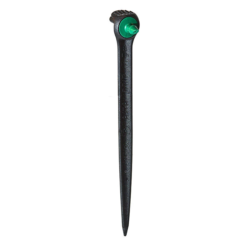 A landscape and nursery dripper incorporating an anchoring spike that delivers precise amounts of water direct to the plant root zone.This Pressure Compensating (PC) spike dripper has a sealed turbulent flow path and diaphragm to maintain uniform discharge rates over a wide range of pressures.